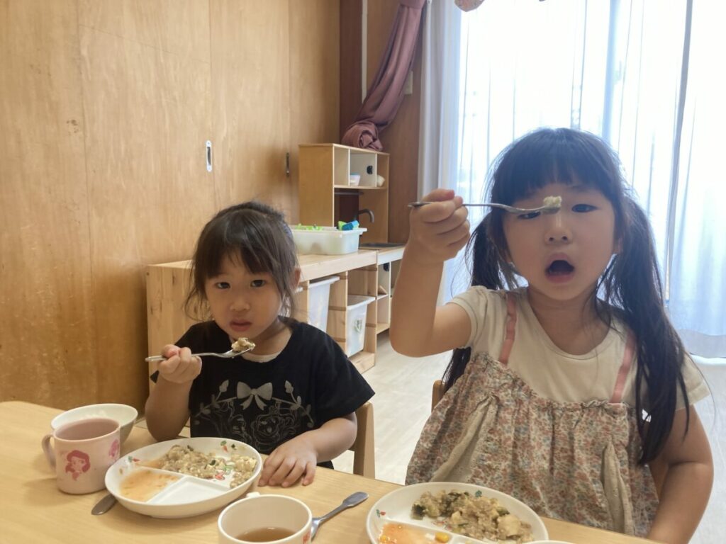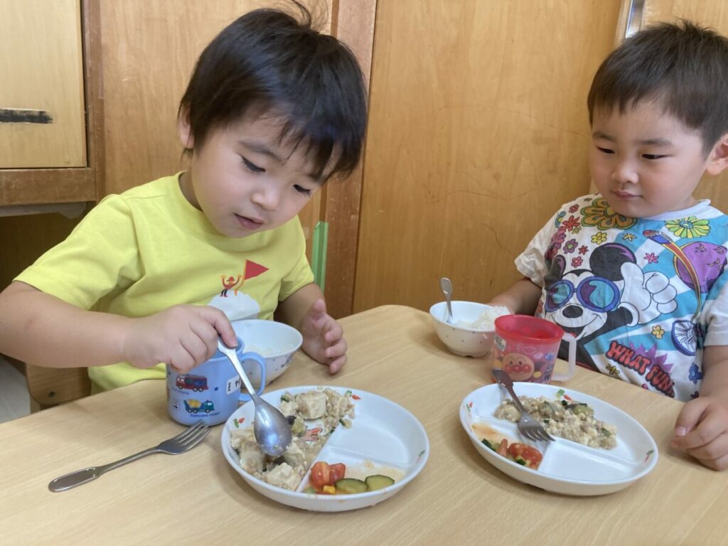 給食で、麻婆豆腐の中に収穫したナスを入れてもらい食べました。ナスを育てる前は、ナスの見た目で「これ、不味そう」や「食べたくない」と話し、ナスが苦手な子が多かったのですが、ナスを収穫してからは「これはナスかな?」や「どんな味がするのかな?」と、ナスに興味を持って食べてみようとする姿が見られるようになってきました。食べてみると美味しかったみたいで「美味しいね」と、全部食べて嬉そうでした。