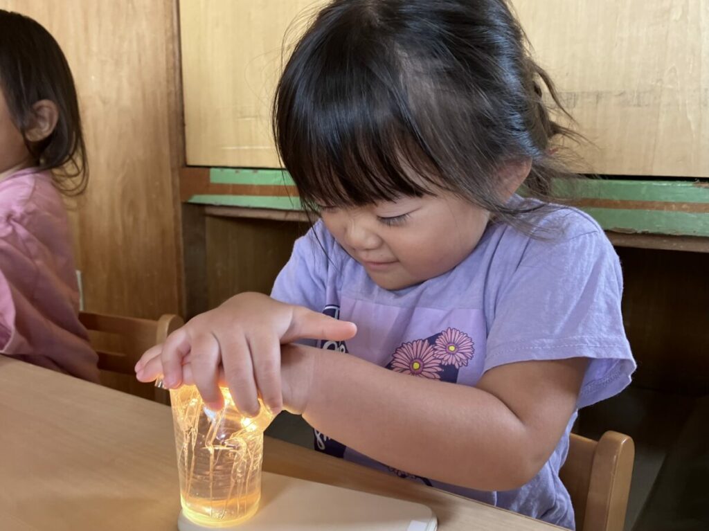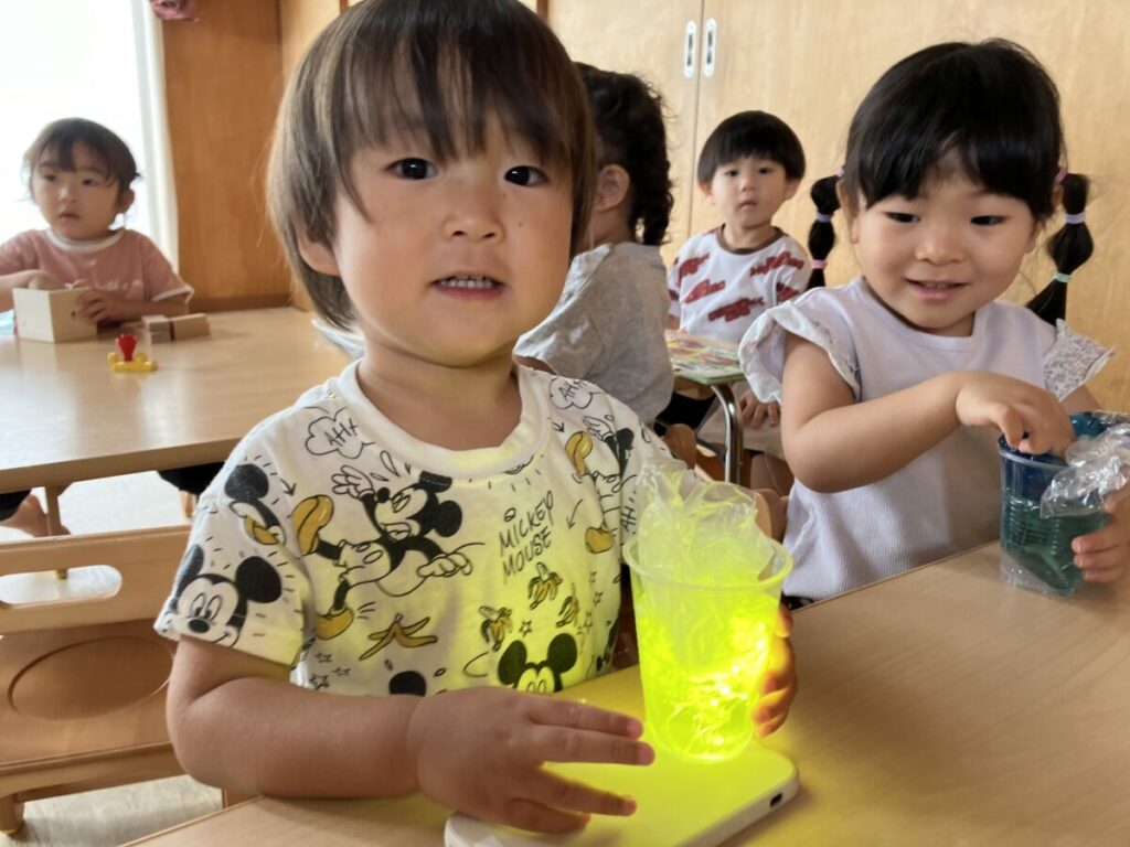 翌日、色水にライトを当ててみるとキラキラと輝きました。綺麗な光を見ると「きれいだね」「〇〇ちゃんは青にしたの?」と楽しそうに笑い合っていました。