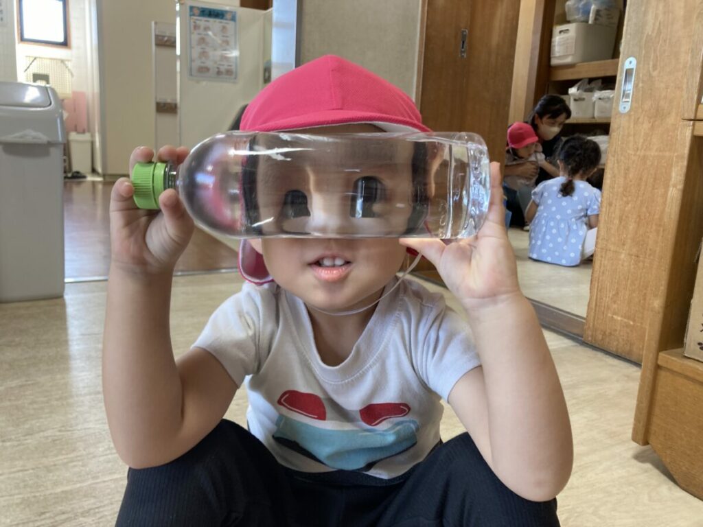 ペットボトルを覗いてみると目が大きくなりました。友達の目が大きくなったのを見て驚き、きゃっきゃっと楽しそうな笑い声が溢れていました。