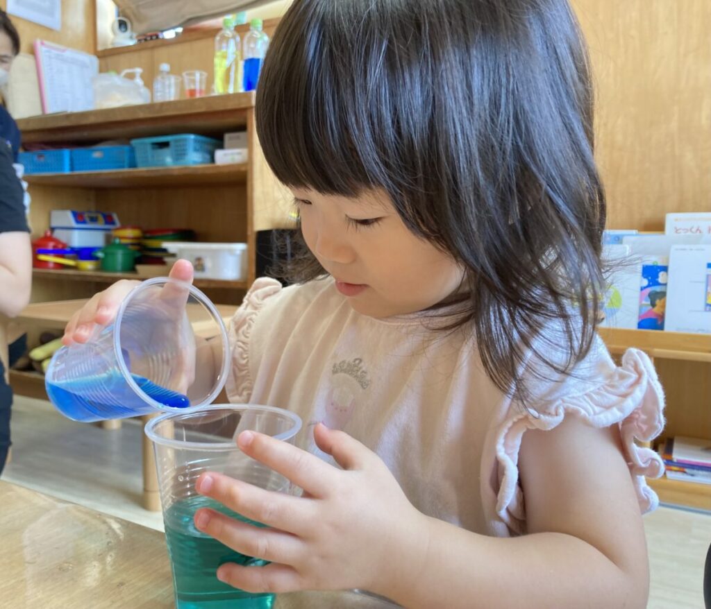 2歳児クラスで色水遊びを行いました。まずは色水を作る前にペットボトルに入れた水を観察しました。