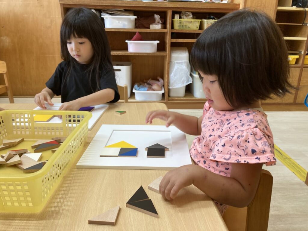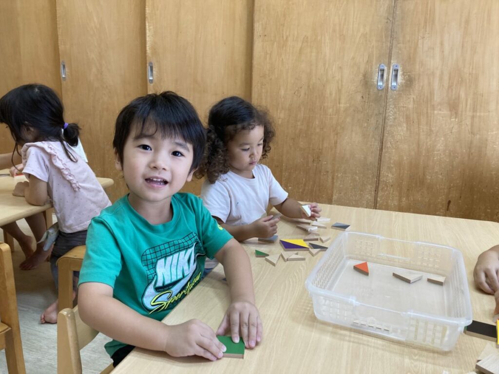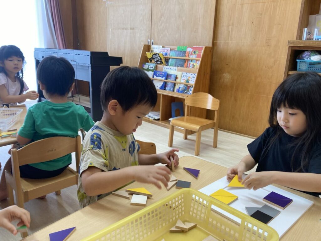 「これはなんの形に見える?」という問いかけから「さんかく」「おうち」と形を認識して、子どもたち自身がイメージするものをしっかりと伝えてくれましたよ。