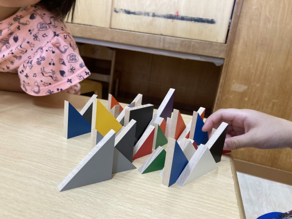 このケルンモザイクは、Wakuブロックの立方体を平面に6つにカットされた厚さのものです。そこに色がついているので、子どもたちは「これはなんだろう」とワクワクした表情で先生の話しを聞いていました。
