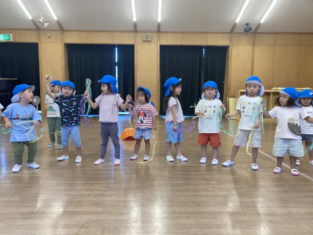 子どもたちが好きな色を選び、保育者と一緒に鈴蘭テープを裂いてポンポンを作りました。手作りのポンポンを持つと「もじゃもじゃを踊るんだね」とやる気満々の子どもたち。子どもたちで順番に並んでスタンバイしています。入場すると、初めのポーズを分かっていて自ら進んでしゃがんで「みんな、初めのポーズだよ」や「しゃがんでね」と、友だちに教える姿が見られるようになりました。