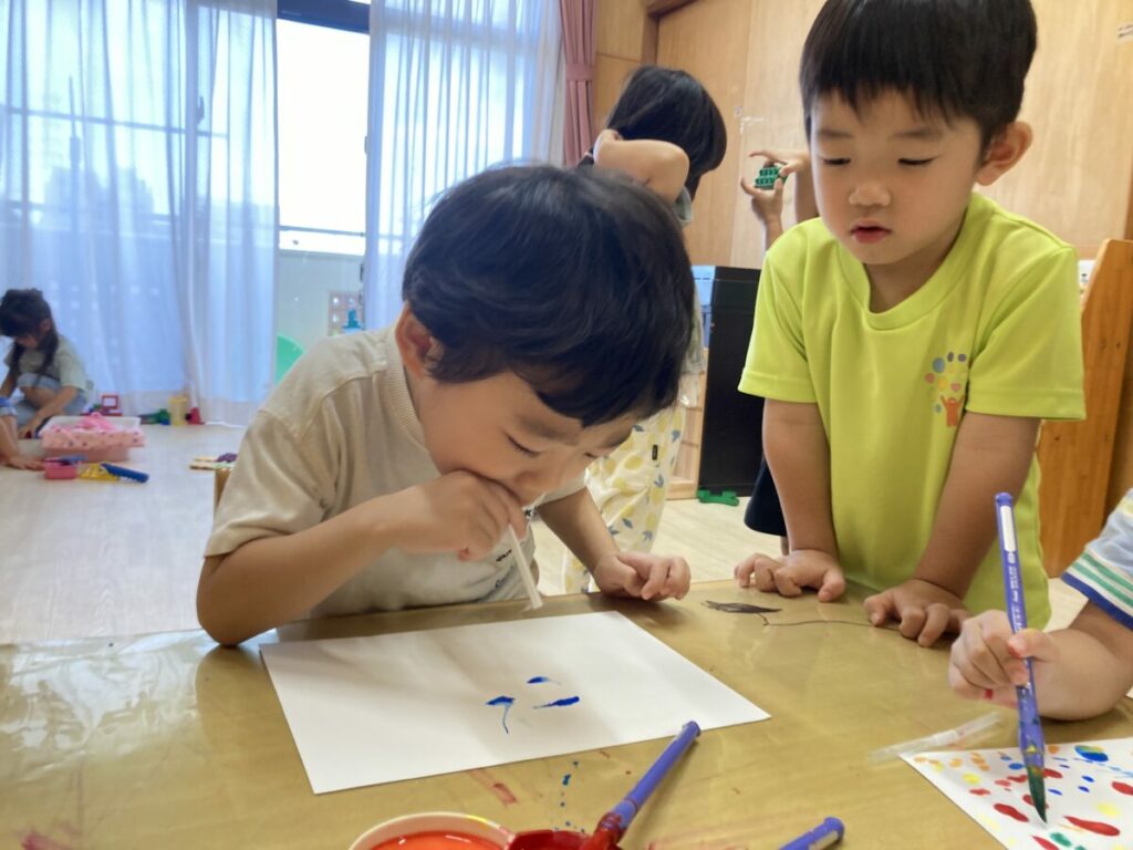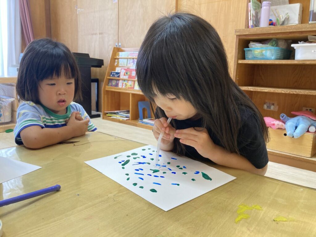 吹き絵をしている様子が気になって、近くでみる子もいました。