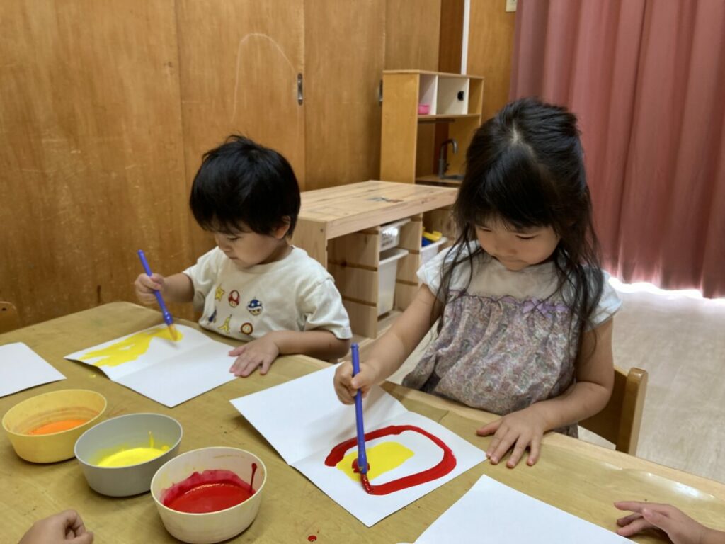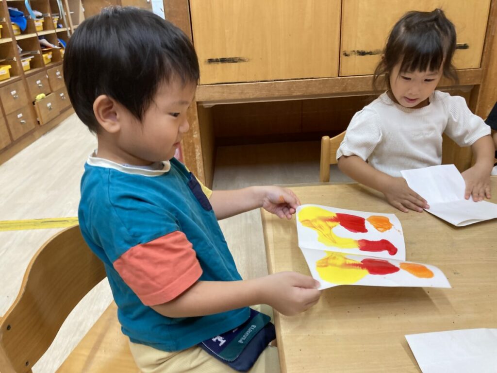 2つ目は、カボチャのオバケを作りました。保育者が「カボチャは何色かな?」と問い掛けると「オレンジ・緑」など意見がありました。その中から黄色・オレンジ・赤の3種類でデカルコマ二ーを行いました。画用紙の片面に絵の具で色を塗り、画用紙を半分に折って開いてみると、紙全体に色が付くので「わー、すごい」や「なんで、色が付いたのかな?」と不思議そうにしていましたが「画用紙を半分に折ったから、色がくっついたのかな」と、何故、色が付いたのか考える様子が見られました。