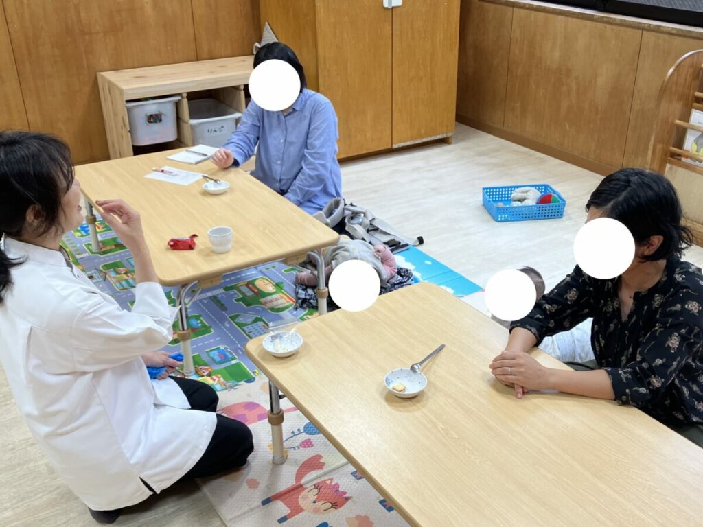 栄養士からの離乳食の進め方の話に加え、子ども目線になって実演も行いました。