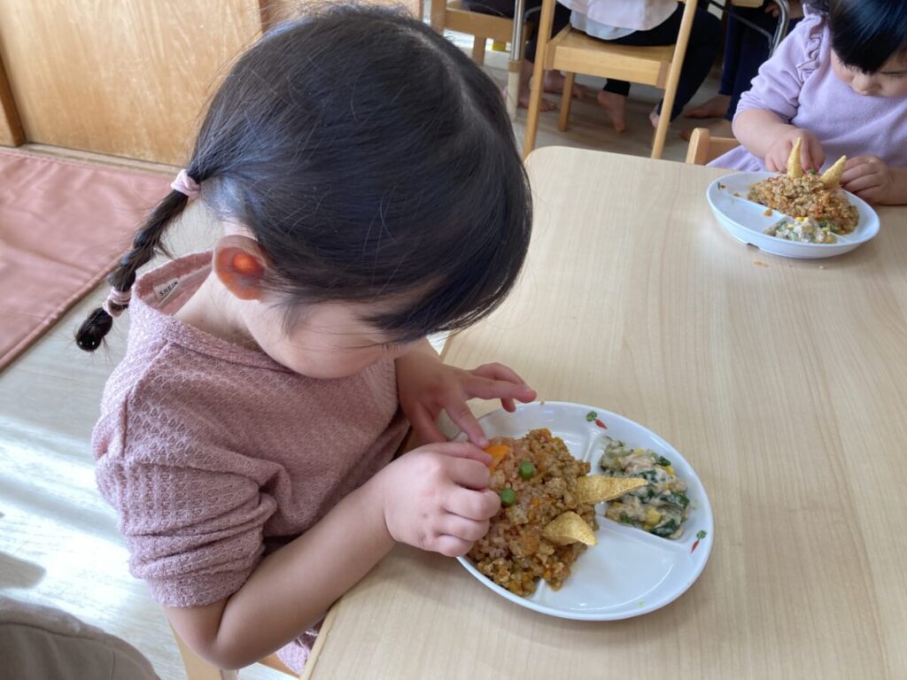 完成したおにカレーを見て、「おにカレーを食べちゃえば、鬼もやっつけられるね」と嬉しそうにパクパク。