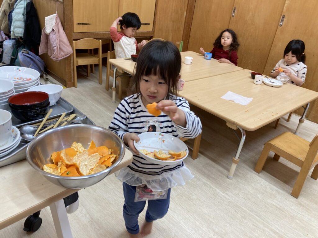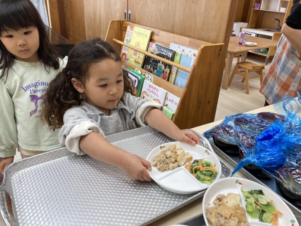 3歳児クラスは進級に向けて、給食の配膳の時に、自分の食事を運んでいます。取り組み始めた頃は、食事をこぼさないかとソワソワしていましたが、毎日運んでいくうちに、皿を両手でしっかりと持って運べるようになりました。