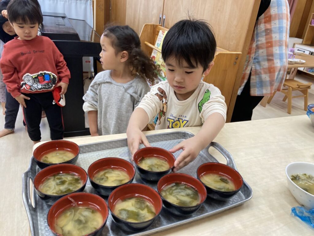 年上の友達と同じように、食事の配膳や片付けが出来るようになって、お兄さんやお姉さんみたいになれたことに喜ぶ姿が見られます。