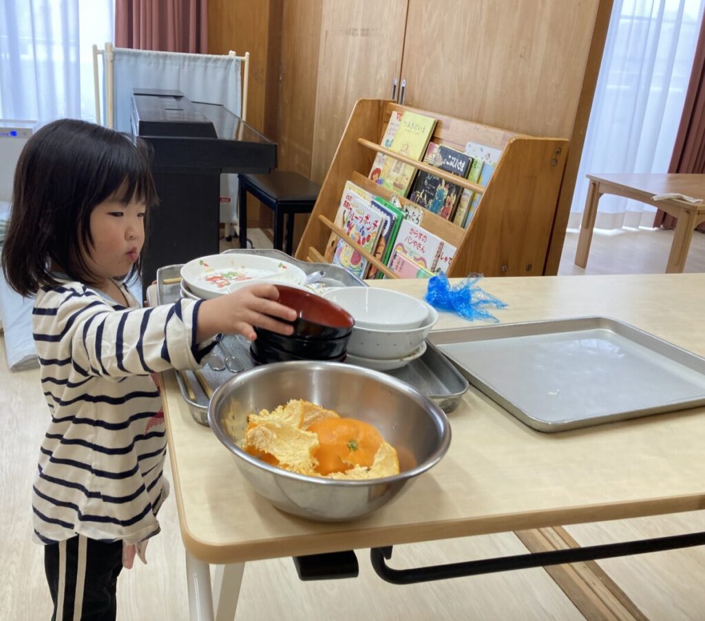 食べ終わると、自分で皿を片付けています。「ご飯のお皿は何処に置くのかな?」と同じ皿を探し重ねて置いています。果物の皮を皿の上に置いたまま片付けていましたが、指定の場所に皮を入れてから、皿を片付けるようになりました。