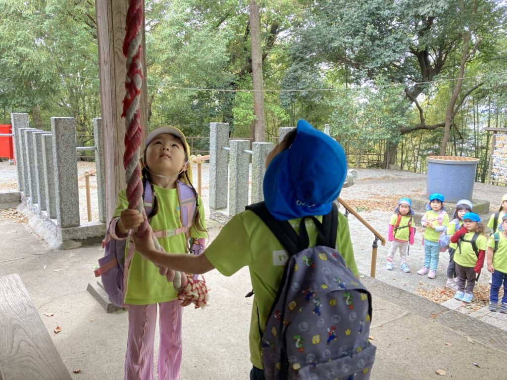 4,5歳児クラスでは、進級してから初めて山田神社まで散歩に行きました。