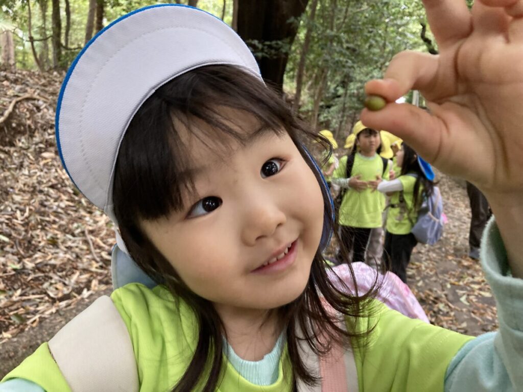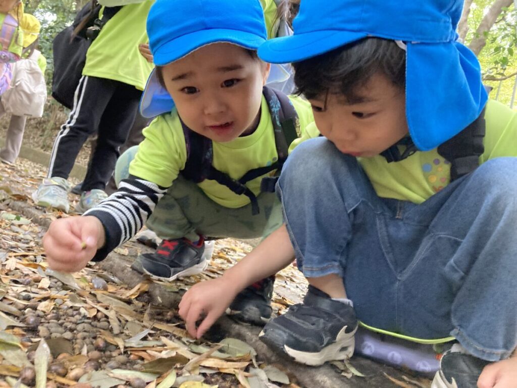 下を見てみるとどんぐりや木の実がたくさん落ちていたり、ダンゴムシなどの生き物がいたりと自然物に気がつきました。みんなで観察を楽しんでいると、年長児が「神様のどんぐりかもしれないから持って帰るのはやめよう」「公園に行ってどんぐりを拾おう」と教えてくれました。その声を聞いた他の子どもたちも「そうだね。今度はみんなで公園に行こうね」と約束をする、微笑ましい姿がありました。