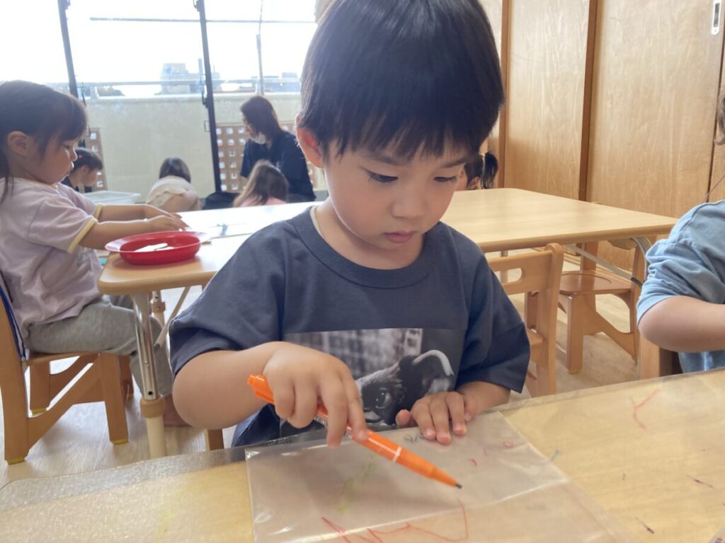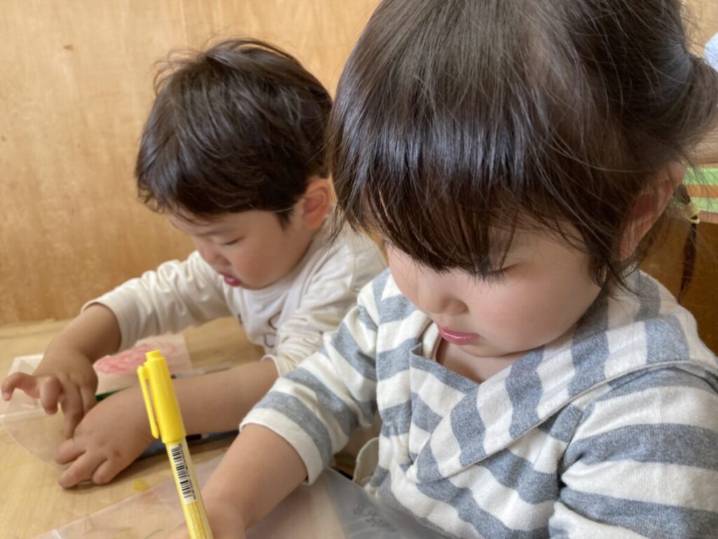自分だけのバックに入れて遊びの幅を広げられるよう、紐をつけたジップロックを用意して『探検バック』として使っていくことにしました。まずは探検バックにお絵描きをし、それぞれの個性あふれる素敵な探検バックに大変身です。