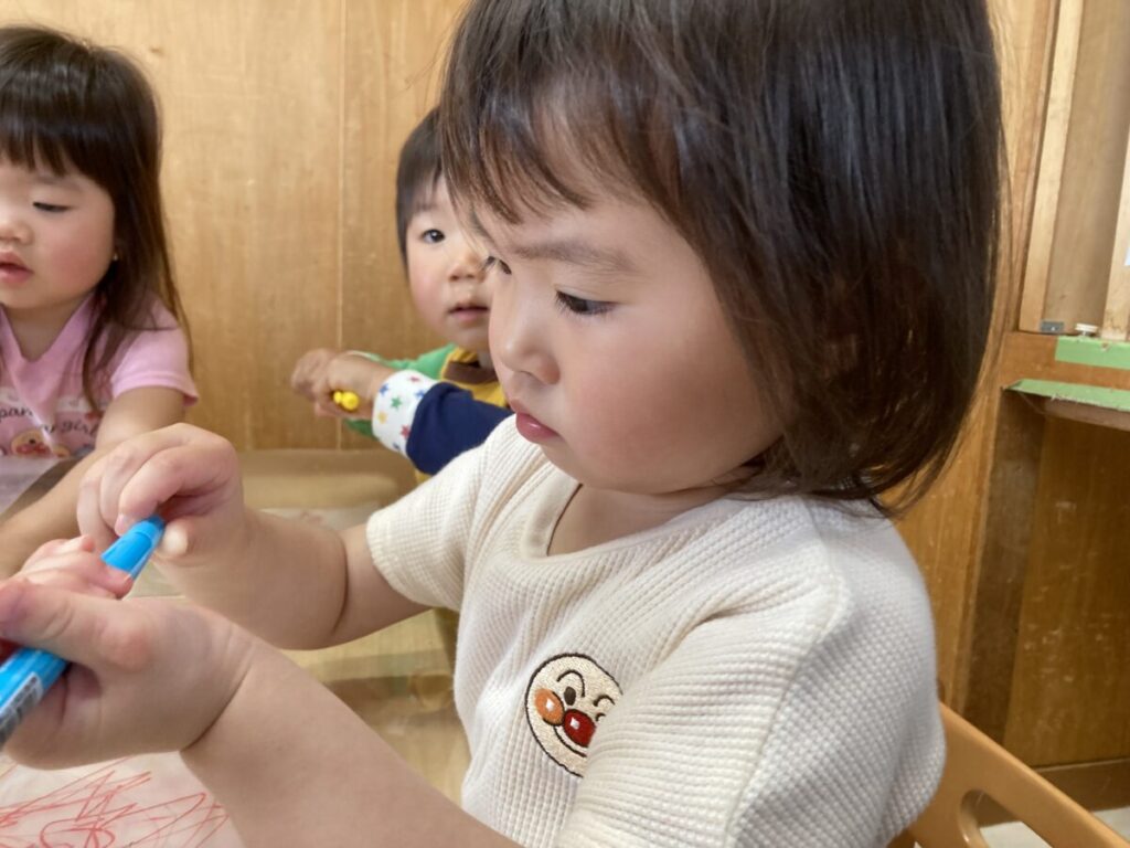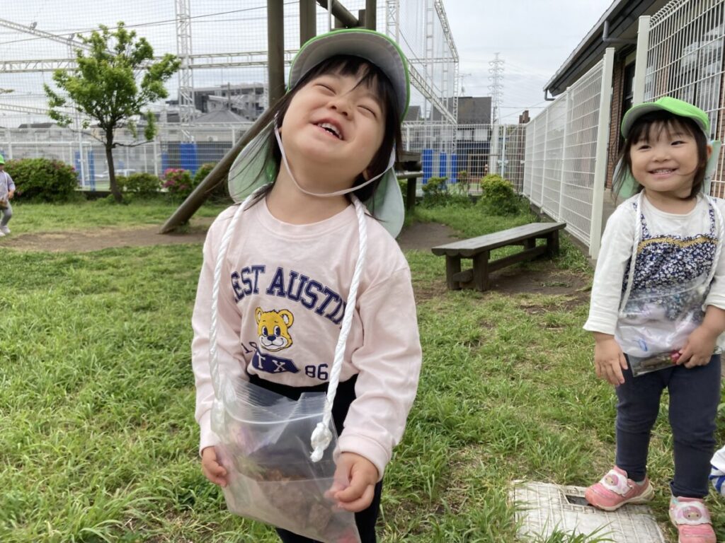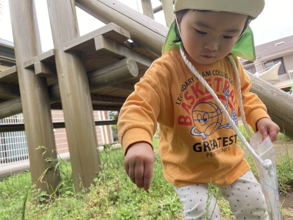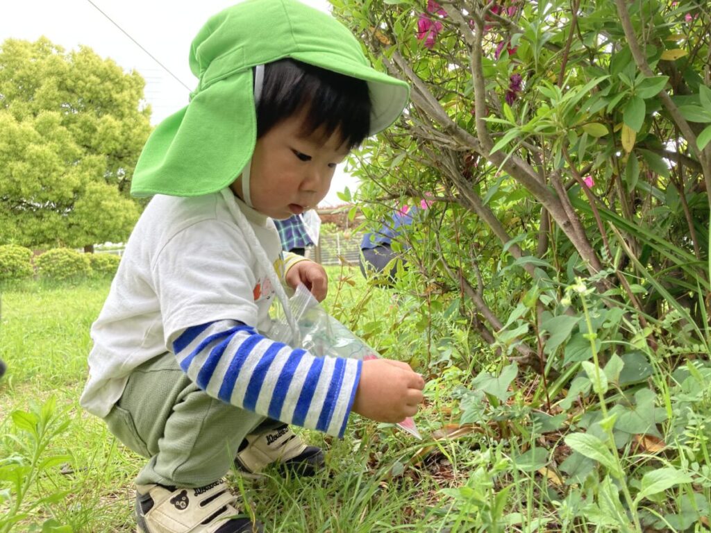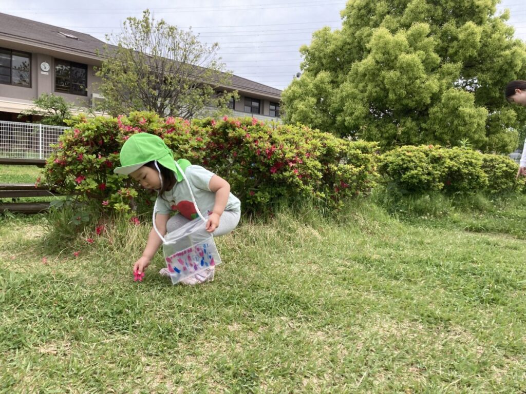 2歳児クラスでは、花や葉っぱ、木の実などの自然物を集めて楽しんでいます。
